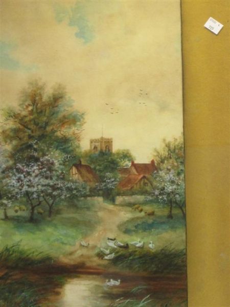 A Village Scene with Church, Cottages, Ducks and Sheep by a Pond