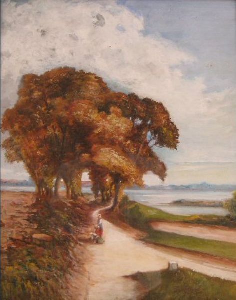 Figures on a country track, river estuary in the background