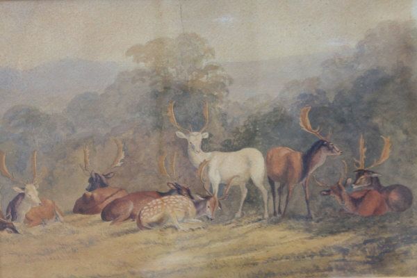 Bull with herd of cattle beside a railed fence, two maidens beside a tree in a landscape