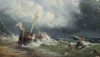 | A dismasted merchant vessel wrecked on the beach | |