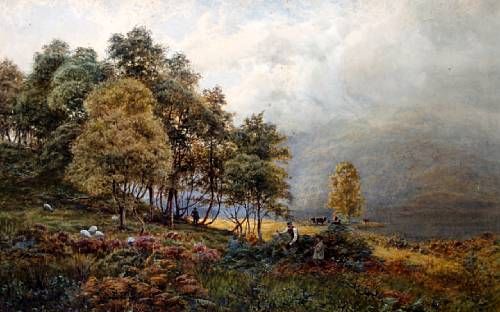 Wooded lake landscape with figures by the lakeside, thought to be Loch Awe
