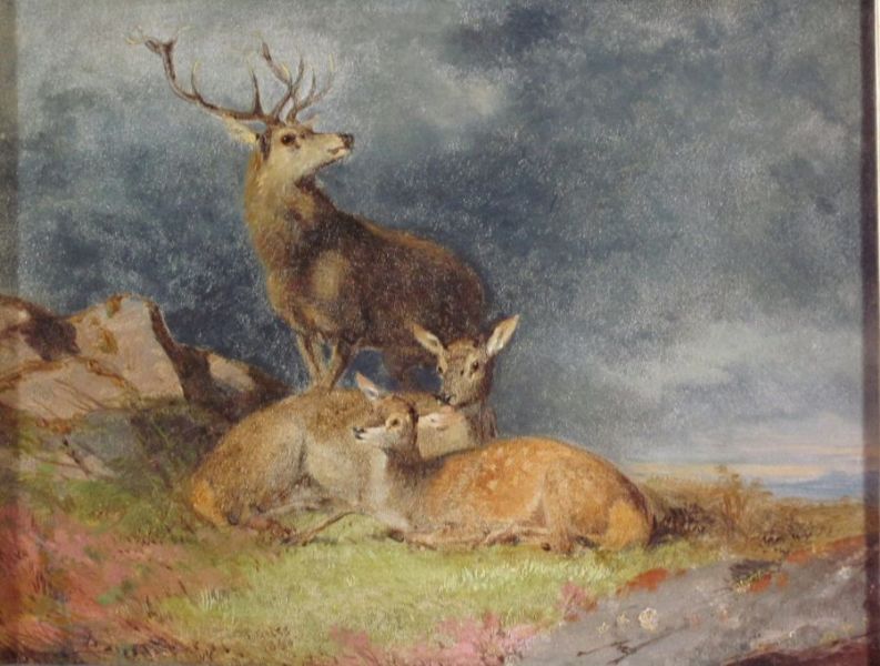A STAG AND DOES IN A HIGHLAND LANDSCAPE