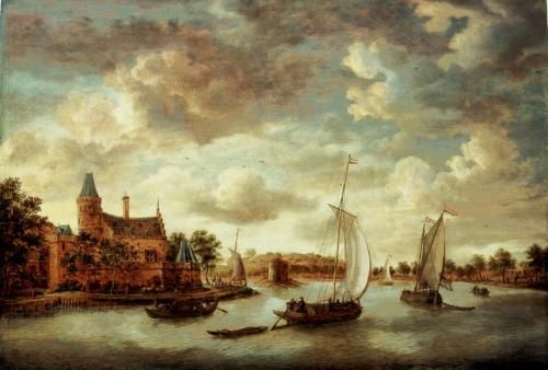 A RIVER LANDSCAPE WITH BARGES PASSING A CHÂTEAU