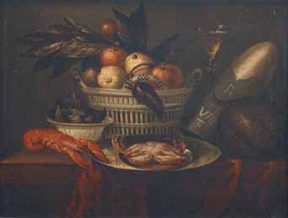 | Nature morte au panier de fruits, crustacés et melon sur une table | |