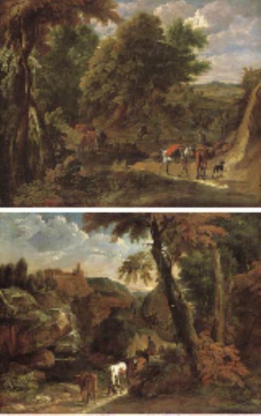 | A landscape with a muleteer on a path and a herdsman resting; and An Italiante landscape with cattle on a path, a fortified towe | |