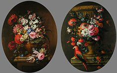 Ovalgemälde mit Blumenstilleben und Blumenstillleben mit Papagei