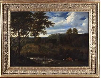 | A WOODED RIVER LANDSCAPE WITH BARGE, FIGURES AND ANIMALS | |