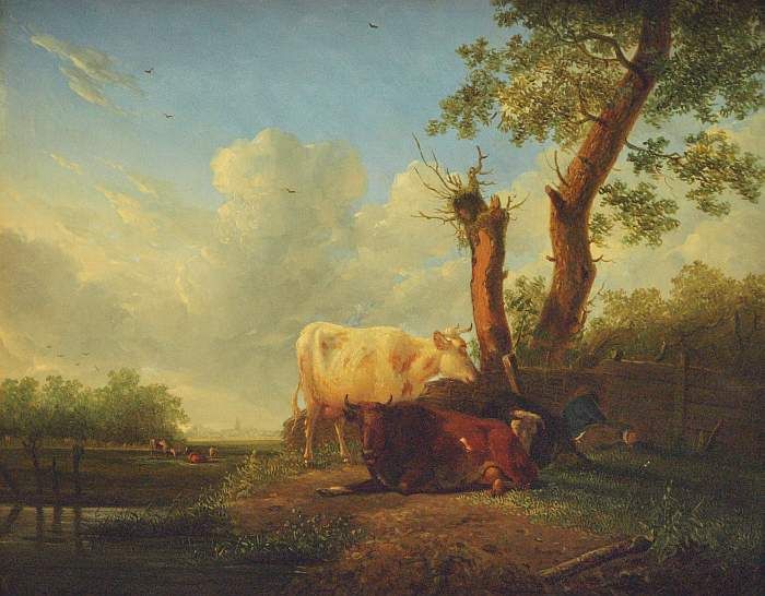 | Schlafender Viehhirte mit seinen Kühen in sommerlicher Landschaft | |
