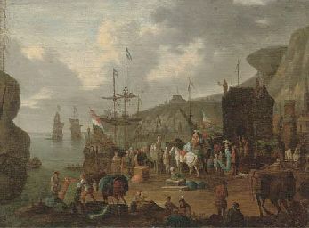 | A Mediterranean harbour with stevedores unloading and elegant company on the shore | |