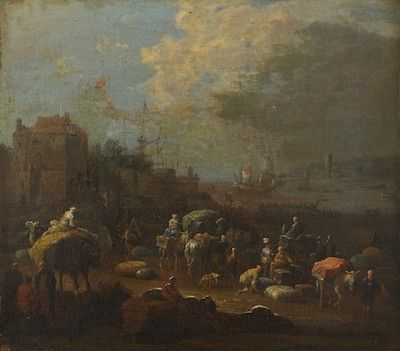 | Figures in Orientalist costume at seaport, with cargo, horses and camels, several figures in foreground | |