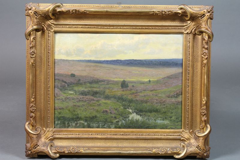 | a moorland scene with a stream and heather and a forest in the distance | |