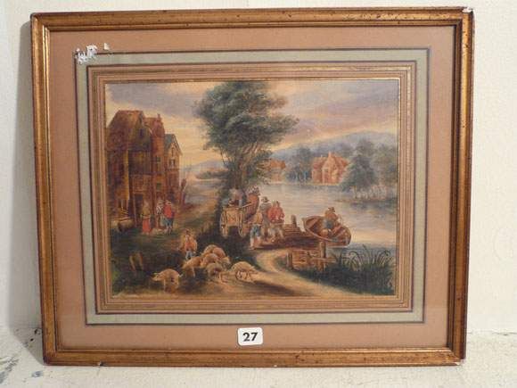 | Scène de village au bord d'un fleuve avec cochons, carrioles et villageois | |