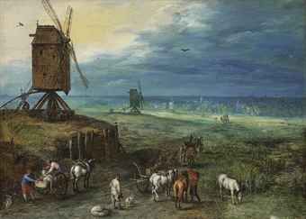 | An extensive landscape with figures unloading carts beside a windmill on a knoll | |
