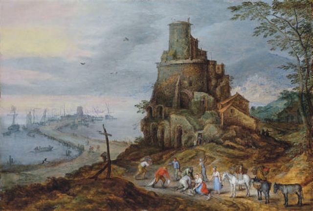 | A coastal landscape with fishermen with their catch by a ruined tower | |