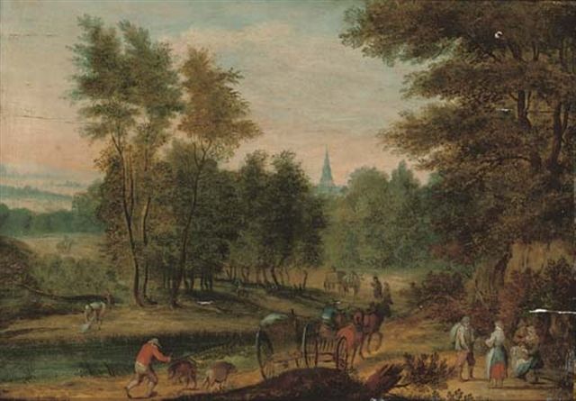 | A wooded river landscape with travellers on a track, a church beyond | |
