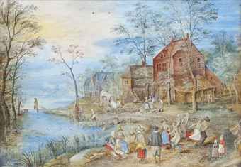 A riverside village with peasants dancing