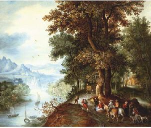 | An extensive mountainous river landscape with horsemen and figures returning from the falconry, villages in the valley beyond | |