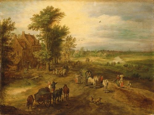 VILLAGE WITH TRAVELLERS AND PEASANTS