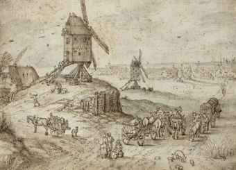 | A landscape with windmills, travellers and wagons in the foreground and a town beyond | |