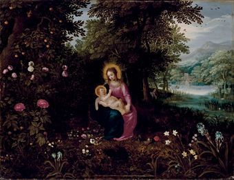 Vierge à l'Enfant dans un paysage fleuri
