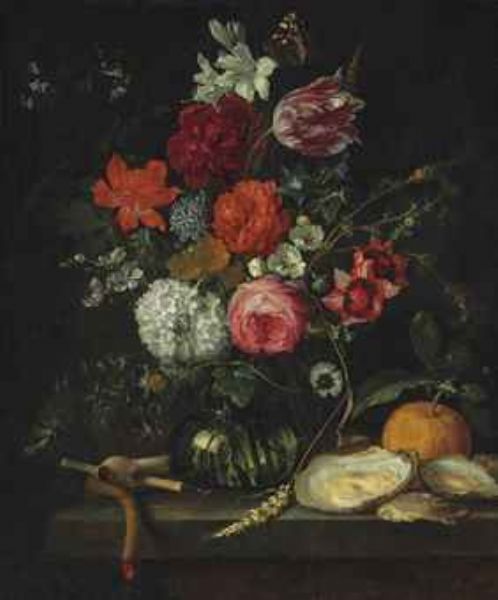 | A tulip, roses, apple blossoms, cornflowers and other flowers in a glass vase on a stone ledge, with a pipe, taper, oysters and | |