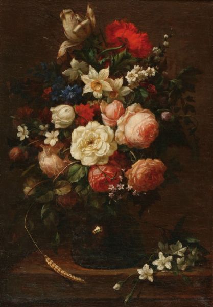 | Still life with multicoloured flowers in a rum bottle on a stone plinth | |