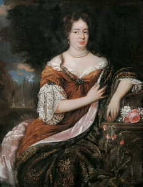 BILDNIS EINER SICH AN EIN STEINPOSTAMENT LEHNENDEN DAME. IM HINTERGRUND EIN PARK