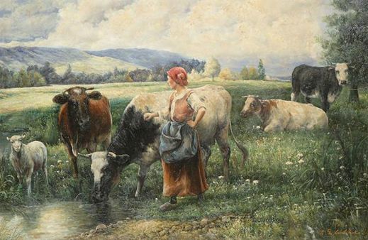 Farmer’s wife with cows near the watering place