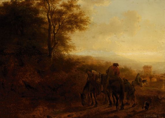 Reizigers op een weg in een Italianiserend landschap