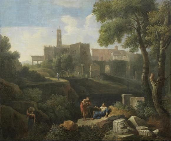 | An Italianate landscape with classical figures conversing and a village beyond | |