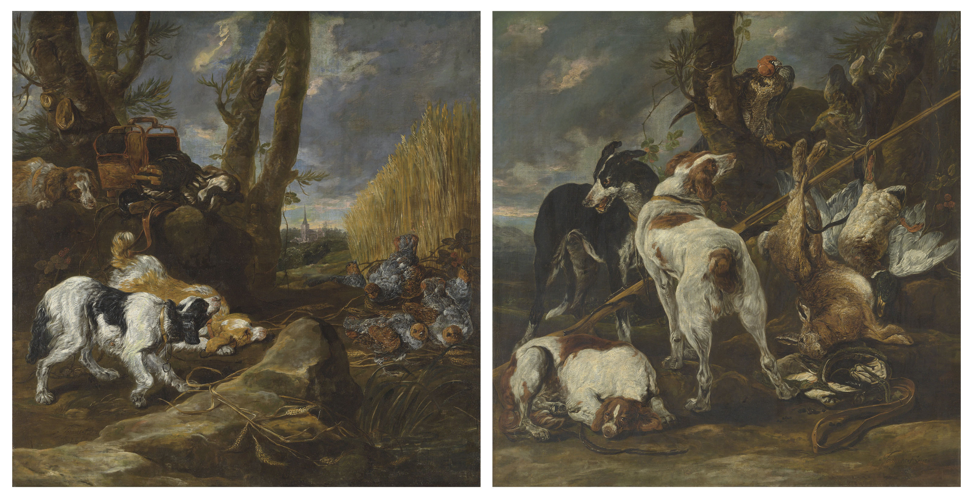 | Hounds with French partridges at bay; and Hounds and a hooded falcon with dead game | |