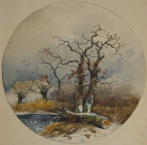 Drawing watercolour, within circular framing line in pen and ink
