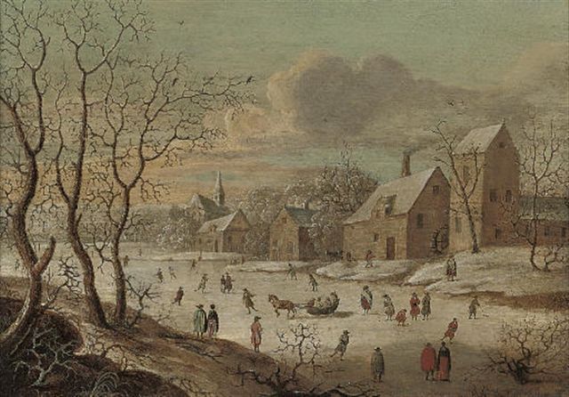 | A frozen river landscape with figures playing kolf, by a village | |