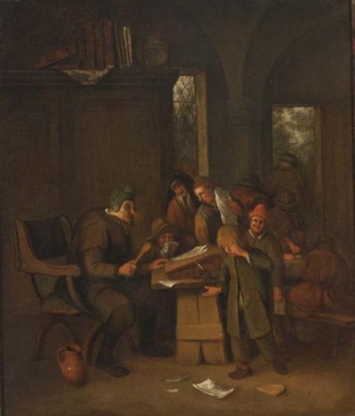 AN INTERIOR OF A CLASSROOM WITH A SCHOOLMASTER PUNISHING HIS STUDENTS