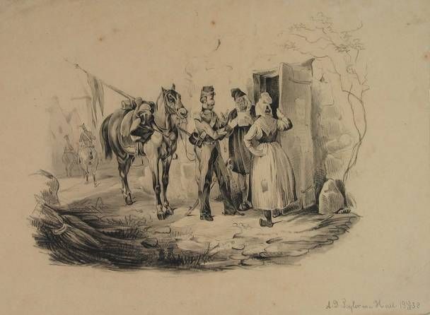 | An officer showing a document to the keeper of a tavern, his horse standing beside him | |