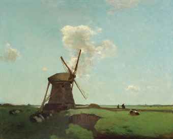 | Workers near a wind mill in a Dutch polder landscape, near Noorden | |