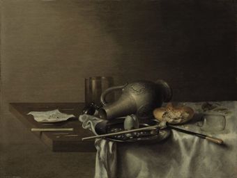 | An overturned stoneware jug, roll, plate with pipe and an egg shell, broken glass and other objects on a draped table | |