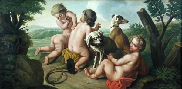 Putti playing with Hounds in a Landscape