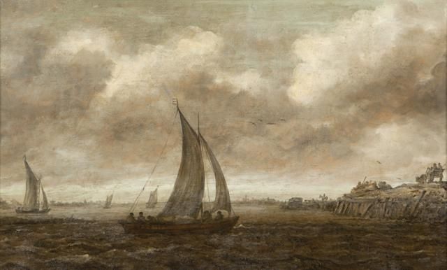 A grey day with sailboats on a river, figures and carts on a nearby shore