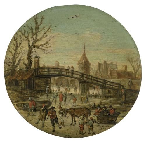 | A WINTER LANDSCAPE WITH FIGURES SKATING ON A FROZEN RIVER BEFORE A BRIDGE, A TOWN BEYOND | |