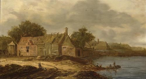 | A FARM ALONG A RIVER AND FISHERMEN IN A BOAT, A FEW FIGURES ON THE RIVER BANK | |