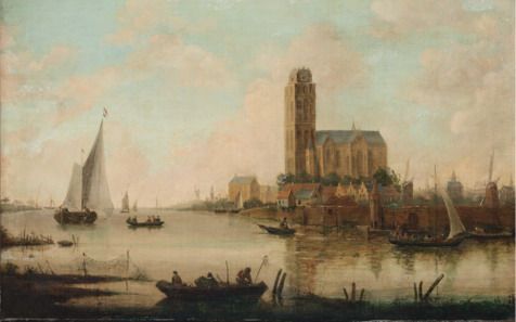 Die Maas bei Dordrecht mit Booten und Blick auf die alte Kathedrale