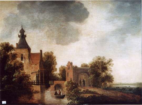 Holländische Landschaft mit Personen in einem Boot vor einem Gemäuer