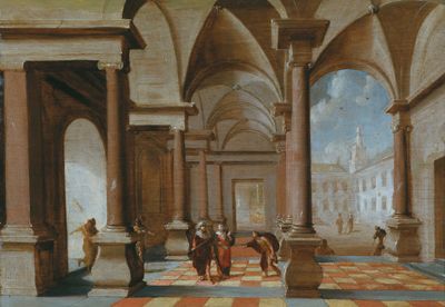 | Interior of a palace with a crowned monarch and other figures and a view of a square at the right | |