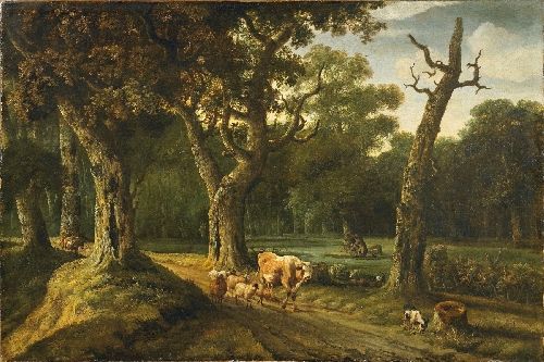 WALDLANDSCHAFT MIT VIEHHERDE UND JÄGER
