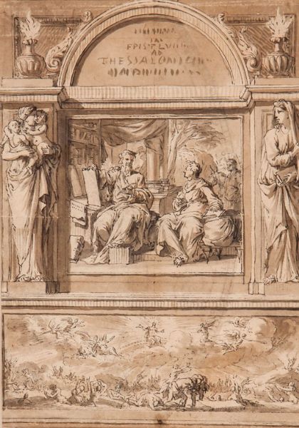 Original illustration for bible title page, with two vignettes surmounted with decorative niche