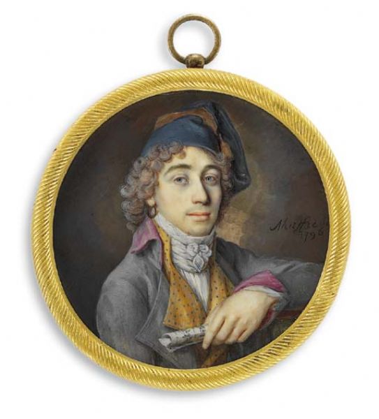 | A gentleman, in grey coat with purple lining, yellow and blue waistcoat, white and blue tied cravat, light brown curled hair wea | |