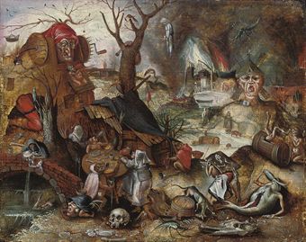 | Hell (recto); and A wooded landscape with a heraldic shield in a tree, a castle beyond (verso) | |