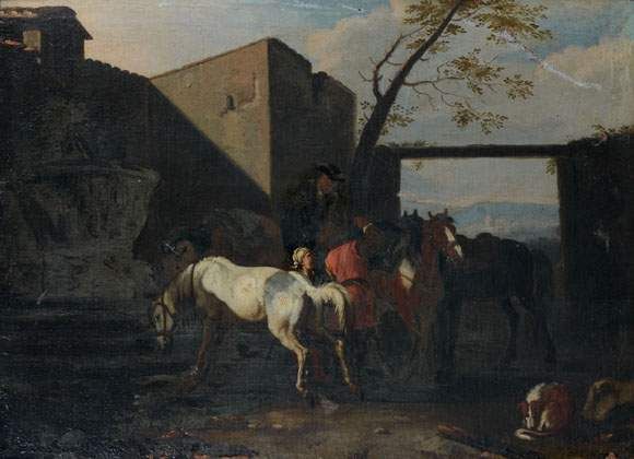 ARRÊT DE CAVALIERS DEVANT UNE FONTAINE.
