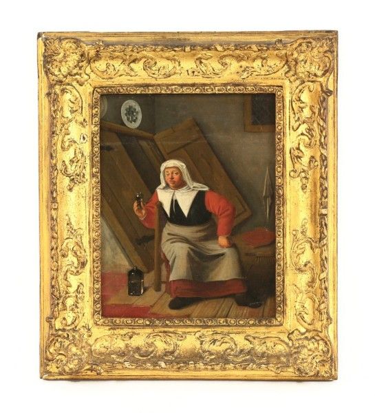A PEASANT WOMAN WITH A GLASS OF GIN IN AN INTERIOR